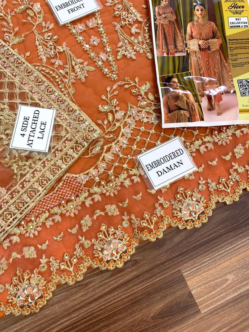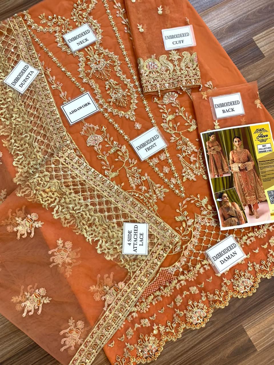 HEER luxury net suit featuring heavy sequence embroidery with detailed adda work, paired with a fully embroidered net dupatta and plain malai trouser—perfect for festive and formal wear.