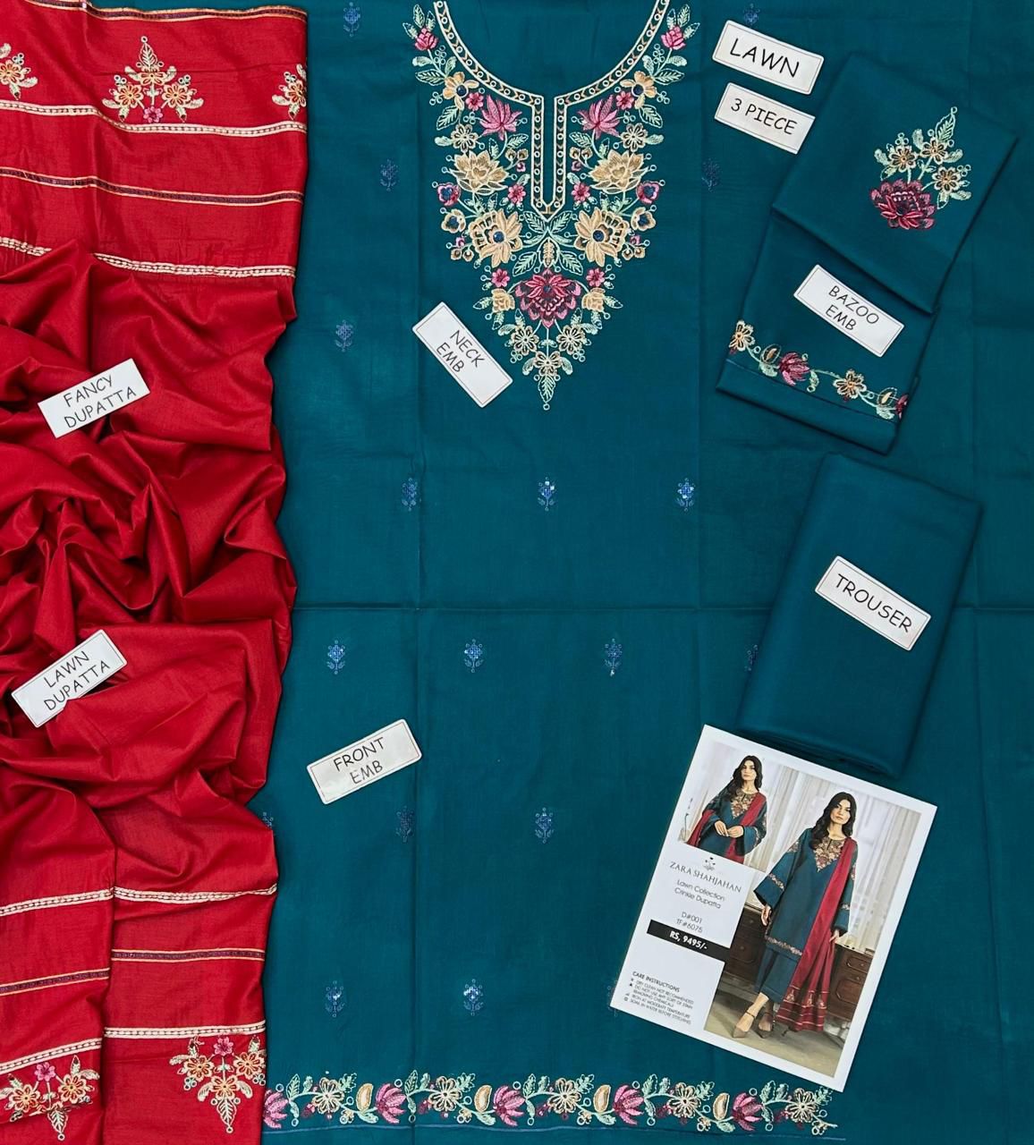 Jazmin 3PC Unstitched Lawn Suit with heavy embroidery on neck, front, sleeves & border, paired with a matching embroidered dupatta and plain lawn trouser.