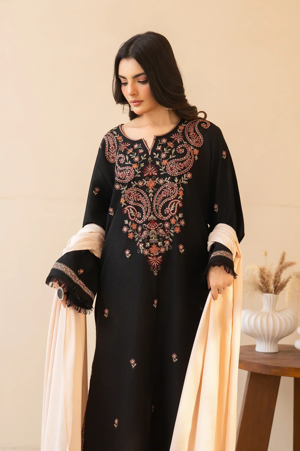 Elegant black 2-piece embroidered suit featuring intricate Kashmiri-inspired detailing, paired with a matching trousar for a timeless winter look.